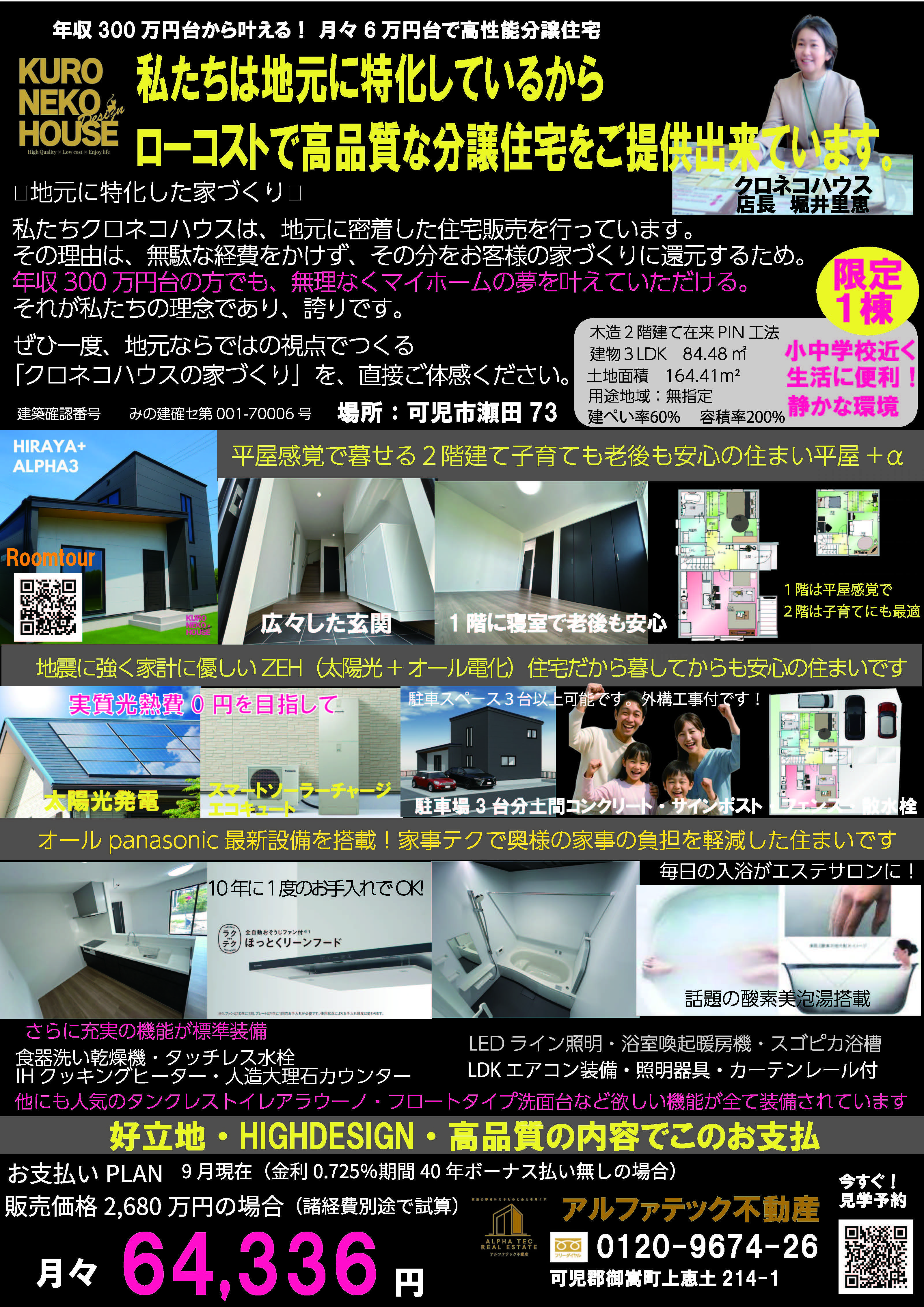 私たちは、お客様の**“今”だけでなく、“将来”**を考えてご提案したい。 なぜなら、無理な家づくりをしてしまい、数年後に家を手放す方が後を絶たないからです。 最近は金利の上昇もあり、 「こんなはずじゃなかった…」と後悔されるご家族が増えています。 せっかく手に入れたマイホームなのに、数年で手放すことになる―― これは私たちにとって、とても残念で悲しい現実です。 💡 クロネコハウスの分譲住宅は… だからこそ、クロネコハウスの分譲住宅は “無理をしない家づくり” を徹底しています。 ✅ 家賃並み、月々の支払いで安心できる資金計画 ✅ 太陽光発電・オール電化で光熱費を抑え、暮らしに余裕を ✅ 高断熱・高気密仕様で、長く快適に住み続けられる性能 ✅ 駐車場や外構工事も込みで「すぐに暮らせる家」 “建てること”ではなく、“暮らし続けられること” それがクロネコハウスの分譲住宅の本当の価値です。 🚪 あなたに伝えたいこと 家は一生の買い物です。 一時の見栄や背伸びで決めてしまえば、後悔に変わります。 でも、無理のない資金計画と、安心できる性能を備えた住まいを選べば、 10年後も20年後も「この家を選んでよかった」と思えるはずです。